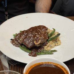 A classic Mexican dish featuring crispy corn tortilla chips simmered in a rich, savory sauce (either red or green), topped with tender roasted chicken, crumbled cheese, and fresh crema.