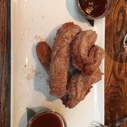 Golden-fried, crispy churros, dusted generously with cinnamon sugar. These classic Spanish-style pastries are served warm, typically with a rich chocolate or dulce de leche dipping sauce.
