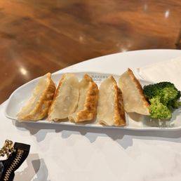 Five golden-brown pan-fried dumplings, boasting a perfectly crispy exterior and a succulent, flavorful pork filling, offering a satisfying texture and taste in every bite.