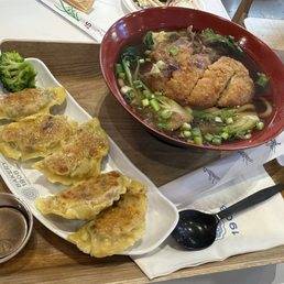Five expertly pan-fried dumplings, each filled with juicy, seasoned ground chicken, offering a delightful contrast between their golden, crispy bottom and soft, savory interior.