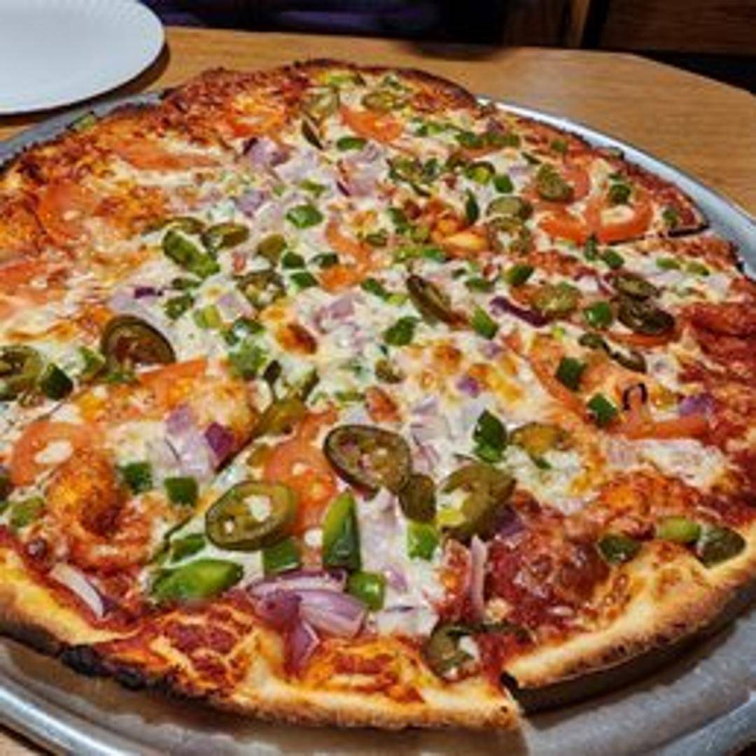 Enjoy a garden-fresh delight with our classic Vegetarian Pizza. This vibrant pie features a colorful medley of crisp bell peppers, sweet onions, earthy mushrooms, ripe olives, and juicy tomatoes, all atop a bed of rich tomato sauce and bubbling mozzarella cheese on our perfectly baked crust.