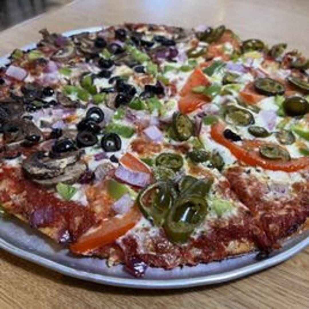 Indulge in a guilt-free pleasure with our No Meat Treat Pizza. This delightful creation is loaded with a colorful assortment of garden-fresh vegetables, savory herbs, and rich cheeses, crafted to deliver maximum flavor and satisfaction without a single trace of meat. A true vegetarian delight!