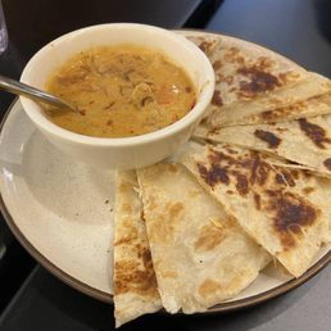 Flaky, buttery Roti bread, perfectly crisped and served alongside our rich and aromatic Massaman curry, featuring tender chicken, potatoes, and roasted peanuts in a mild coconut milk base.