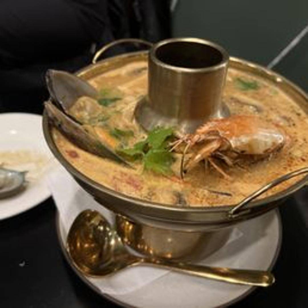 A traditional spicy and sour Tom Yum soup, generously filled with a medley of fresh seafood (shrimp, squid, mussels), mushrooms, and aromatic Thai herbs, served bubbling hot in a communal pot.