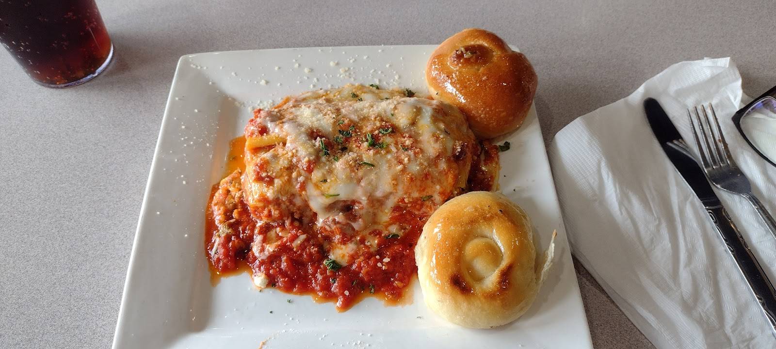 Indulge in a comforting dish of our oven-baked pasta, rich with savory sauce and melted cheeses, creating a warm and satisfying experience. Accompanied by fresh, crusty bread rolls, perfect for soaking up every last bit of delicious sauce.