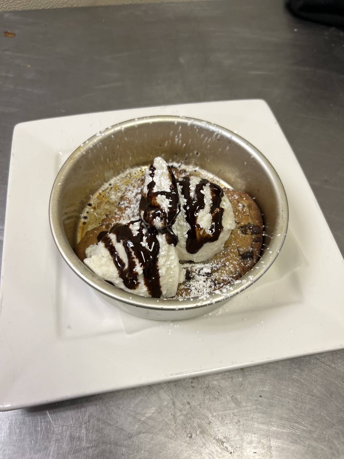 Indulge in a freshly baked, warm and gooey cookie, served à la mode with a generous scoop of rich, creamy vanilla ice cream. A perfect harmony of warm and cool, soft and smooth textures to complete your meal.
