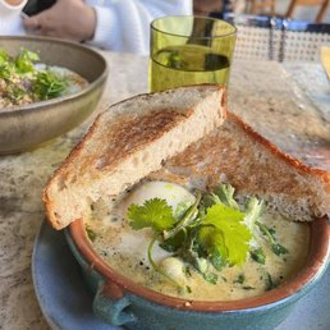 A vibrant twist on a classic, featuring perfectly poached eggs nestled in a luscious, herb-infused green sauce, slow-simmered with fresh spinach, kale, and fragrant spices. Served with warm, crusty bread.
