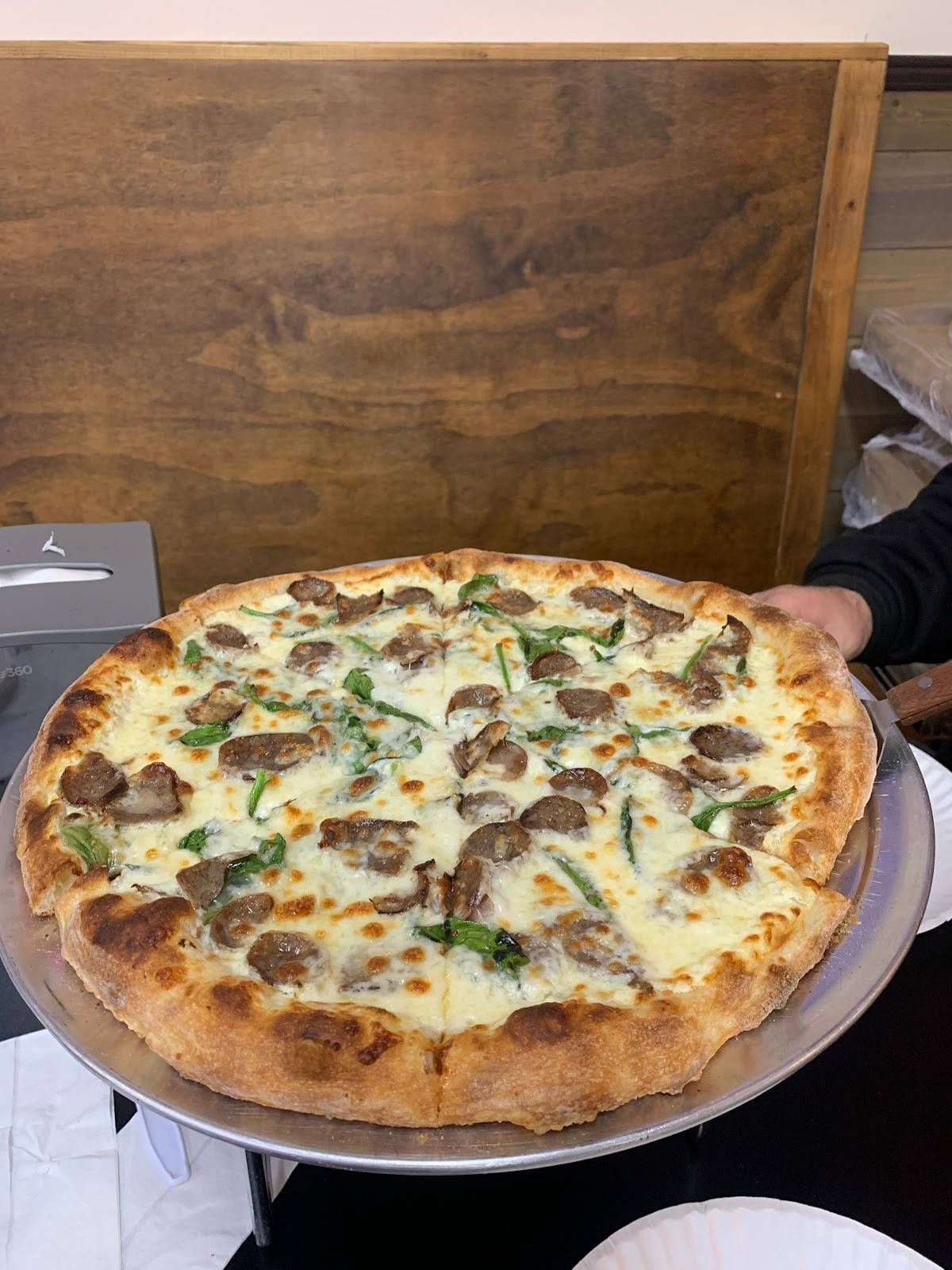 A sophisticated and flavorful pizza featuring a creamy white sauce base instead of traditional marinara. Topped with crumbled, savory Italian sausage, fresh, vibrant greens (such as spinach or arugula), and a blend of mozzarella and provolone cheeses, all baked to perfection on our crispy crust at Pizza By Yandys.
