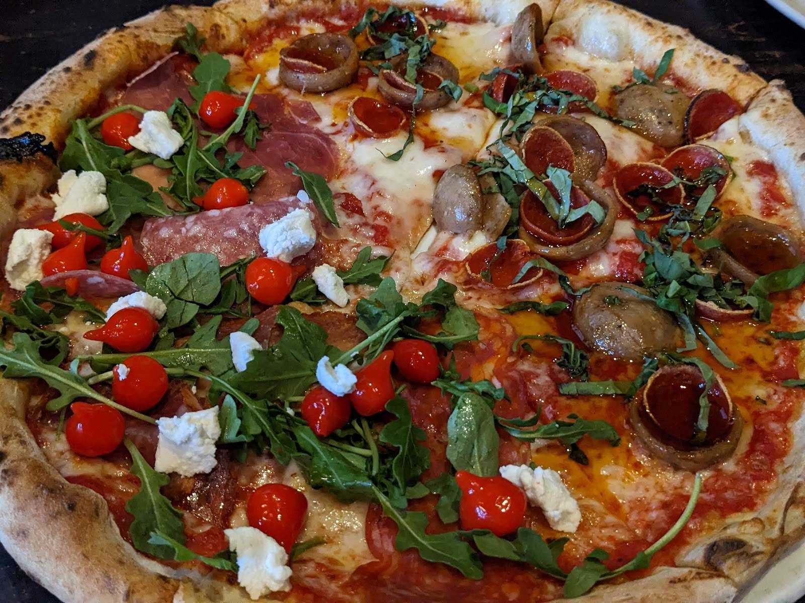 Elevate your pizza experience with our Gourmet Meat and Arugula Pizza, a sophisticated blend of rich and fresh flavors. This culinary creation features an exquisite selection of premium meats, meticulously arranged over a savory base of tomato sauce and fine cheeses. Once out of the oven, it's generously adorned with fresh, peppery arugula, providing a vibrant, crisp counterpoint to the robust, savory meats. This combination offers a balanced, complex, and utterly delicious gourmet experience.