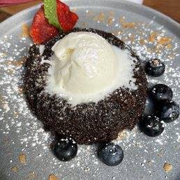 A decadent dessert designed for sharing, featuring a rich chocolate cake with a warm, molten center that elegantly oozes upon cutting. This indulgent treat is often served with a complement like a scoop of vanilla bean ice cream or fresh berries, creating a perfect balance of textures and flavors.