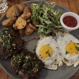 A timeless classic perfect for any time of day, featuring a tender, perfectly cooked cut of steak prepared to your preference, served alongside two farm-fresh eggs cooked just the way you like them. This hearty dish is typically accompanied by crispy home fries or a side of toasted artisanal bread.