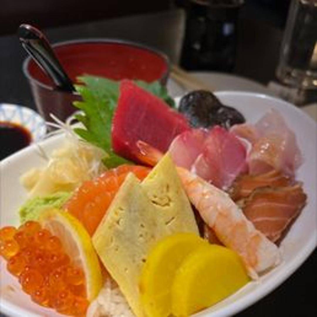 A vibrant and satisfying lunch bowl featuring an artful arrangement of various fresh raw fish and seafood, meticulously placed over a bed of perfectly seasoned sushi rice, accompanied by traditional garnishes.