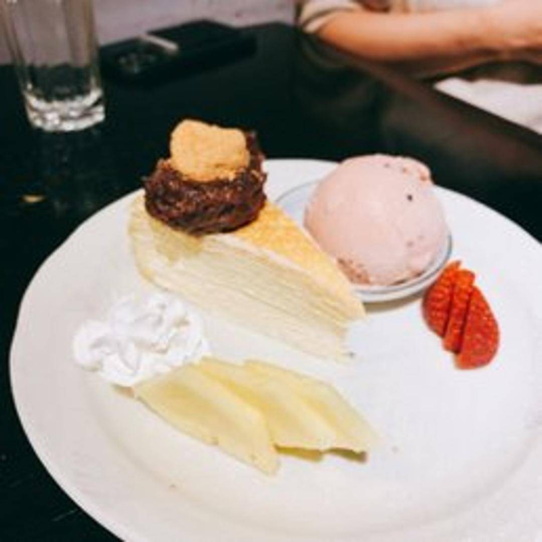 A sophisticated dessert crafted from numerous delicate green tea-infused crepes, meticulously layered with a light and airy pastry cream, presenting a subtle earthy flavor and elegant, melt-in-your-mouth texture.