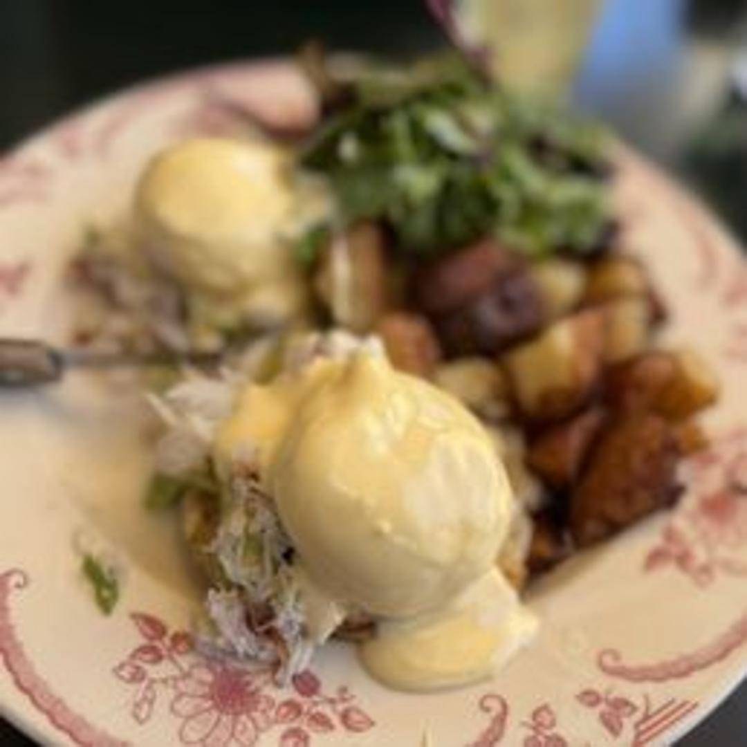 An exquisite brunch creation featuring sweet, succulent crab meat piled high on a toasted English muffin, topped with two perfectly poached eggs and draped in our homemade, zesty hollandaise sauce.