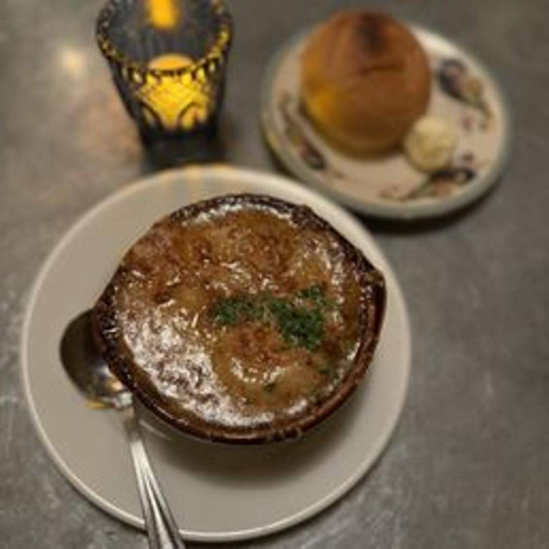 A classic French bistro staple featuring a rich, deeply caramelized onion broth, topped with a crusty crouton and generously blanketed with bubbling, melted Gruyère cheese.